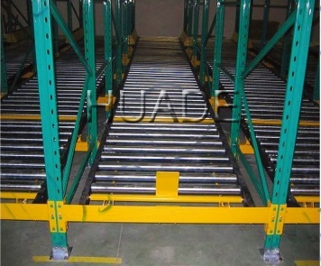 • 滚筒线按一定角度倾斜固定在货架横梁上,托盘从高端放入,沿滚筒线靠自身重力下滑。
